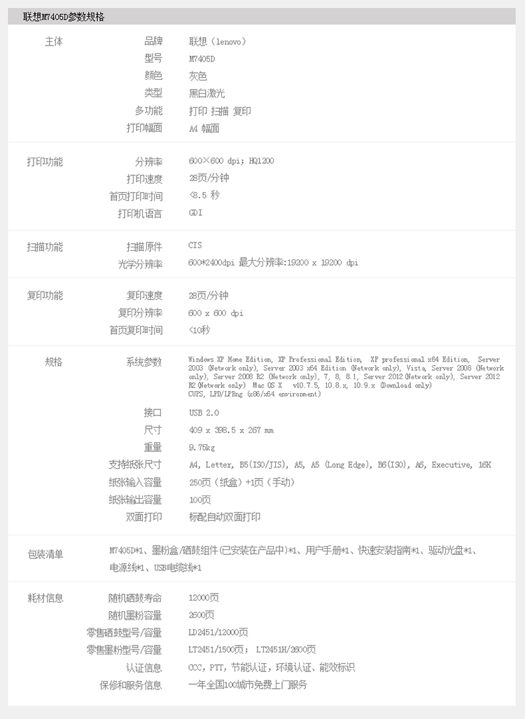 • 產(chǎn)品品牌:聯(lián)想(Lenovo)M7405D激光黑白一體機