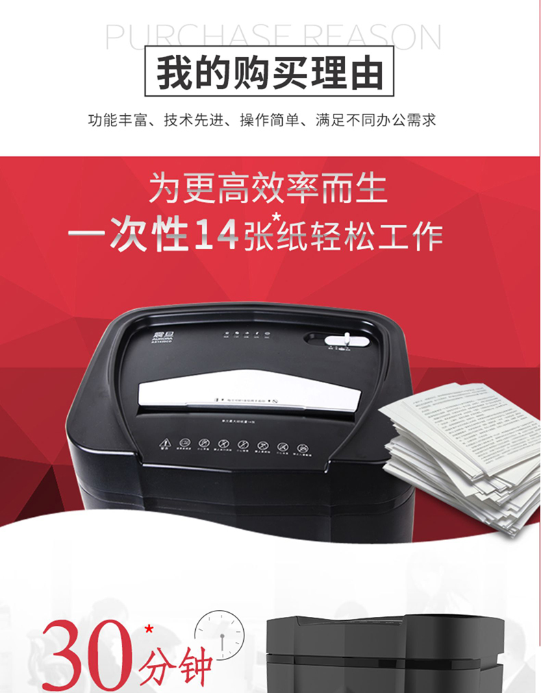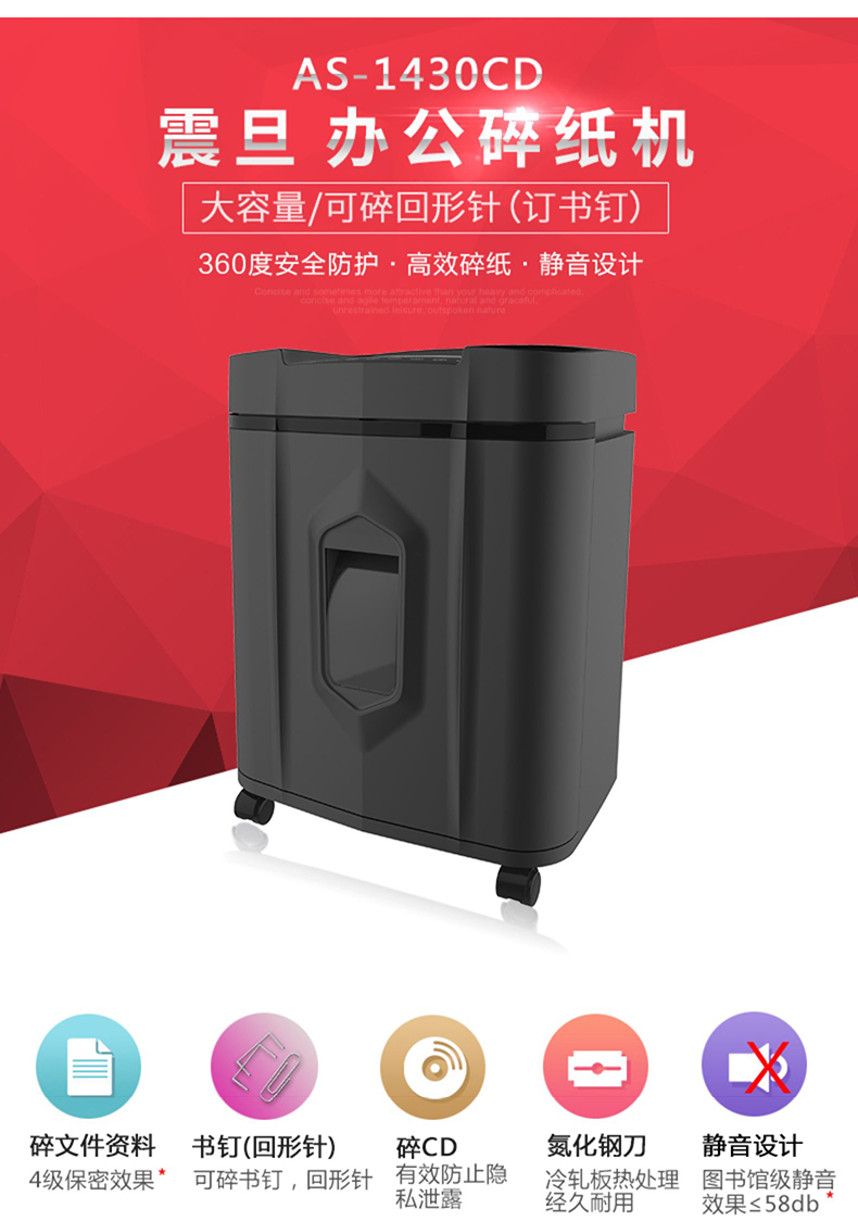 • 產(chǎn)品名稱:震旦 AS1430CD 20L大容量30分鐘長時間4級保密辦公碎紙機