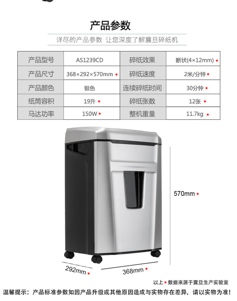 • 產(chǎn)品名稱:震旦(AURORA)AS1239CD大容量專業(yè) 4級保密碎紙機(jī)單次12張低音