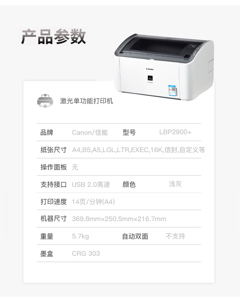 • 產(chǎn)品名稱:佳能(Canon)LBP2900+原裝黑白激光打印機A4幅面 用作業(yè)小型辦公商用財務憑證激光機